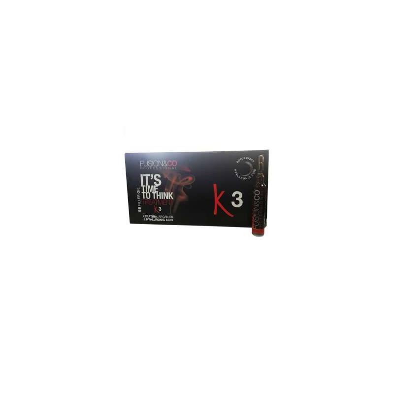 ¡Revitaliza tu Cabello y devuelvele su fuerza! Con el compuesto K3 efecto botox de Fusion&CO tienen sales minerales, cera de tipo amonico y de una base emulsionante de tipo cationico. Aplicado sobre el cabello humedo, produce instantaneamente una accion restructurante en las partes dañadas del cabello. Es aconsejable usarlo especialmente antes y despues de la permanente, el tinte y la decoloracion. El alto poder emoliente facilita el secado y el peinado dando brillo y suavidad, tambien es excelente como tratamiento anticaspa